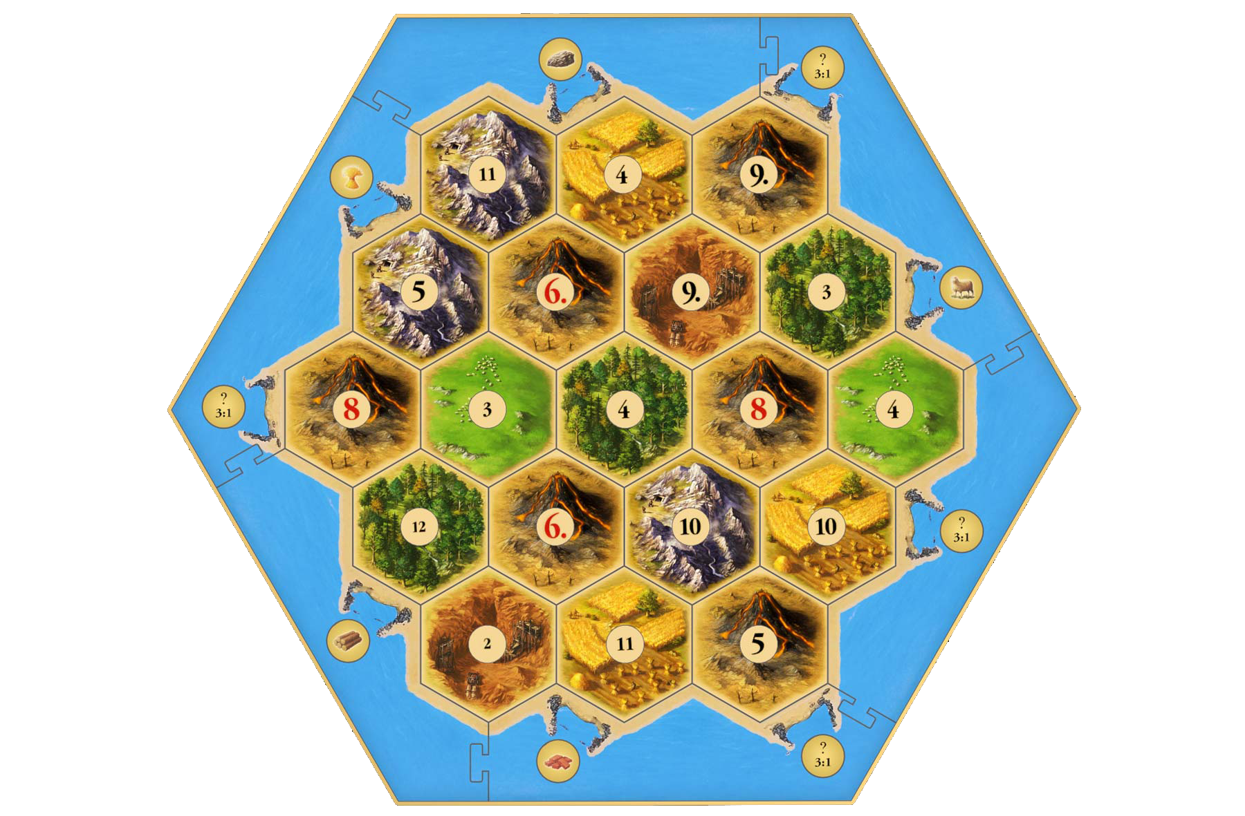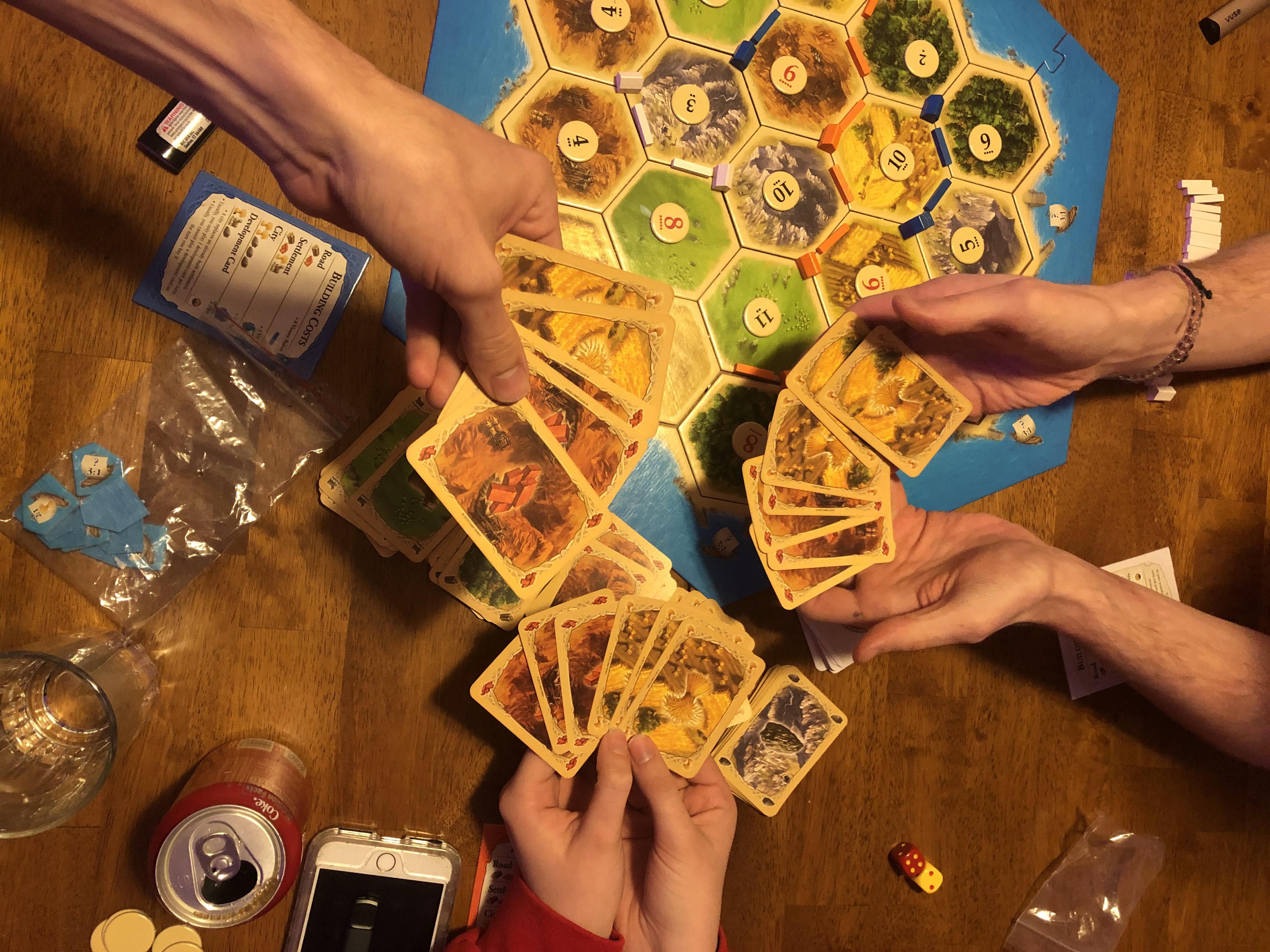 Începututl joculuiIn prima faza se contruieste harta, se aseaza cele 6 laturi care reprezinta oceanul si apoi hexagoanele si peste acestea jetoanele cu numere. Fiecare jucator isi alege o culoare si primeste toate piesele corespunzatoare: 5 asezari, 4 orase si 15 drumuri. Placile cu cel mai lung drum si cea mai mare armata se plaseaza langa harta. Teancurile cu resurse si cartile de dezvoltare se amesteca si se pun in suportul lor. Incepand cu primul jucator fiecare isi plaseaza pe harta 2 asezari si 2 drumuri, restul se pun in fata fiecaruia. Resursele de inceput ale fiecarui jucator sunt cele de pe ultima asezare pusa pe harta. Cartile cu resurse sunt tinute secrete fata de ceilalti jucatori. |