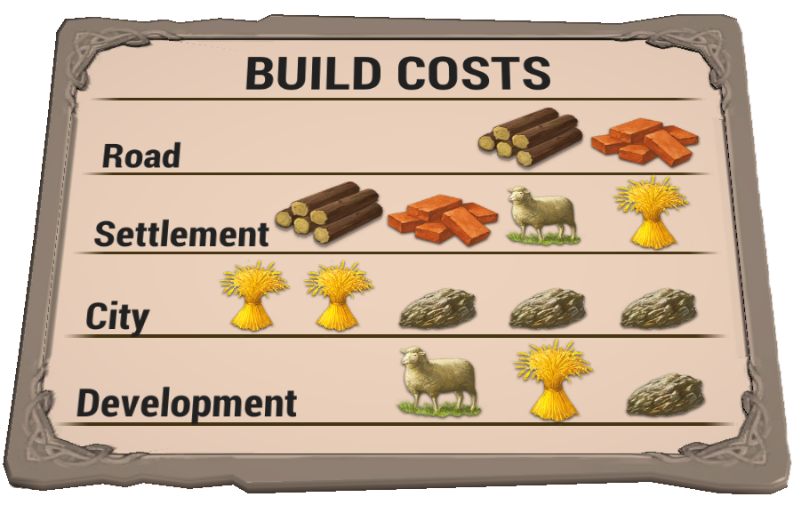 Cum poți construiJucatorul al carui rand este in joc, poate construi asezari/ cladiri sau drumuri pentru a-si mari numarul de puncte. Pentru a construi, jucatorul trebuie sa plateasca catre banca combinatia de resurse in functie de ce se doreste. Pentru aceasta, exista la dispozitie un cartonaș cu resursele necesare fiecărei construcții. De asemenea, se pot lua și cărți de acțiune, fiecare având pe ea explicat rolul pe care îl are. Resursele se decarteaza in suportul special. |